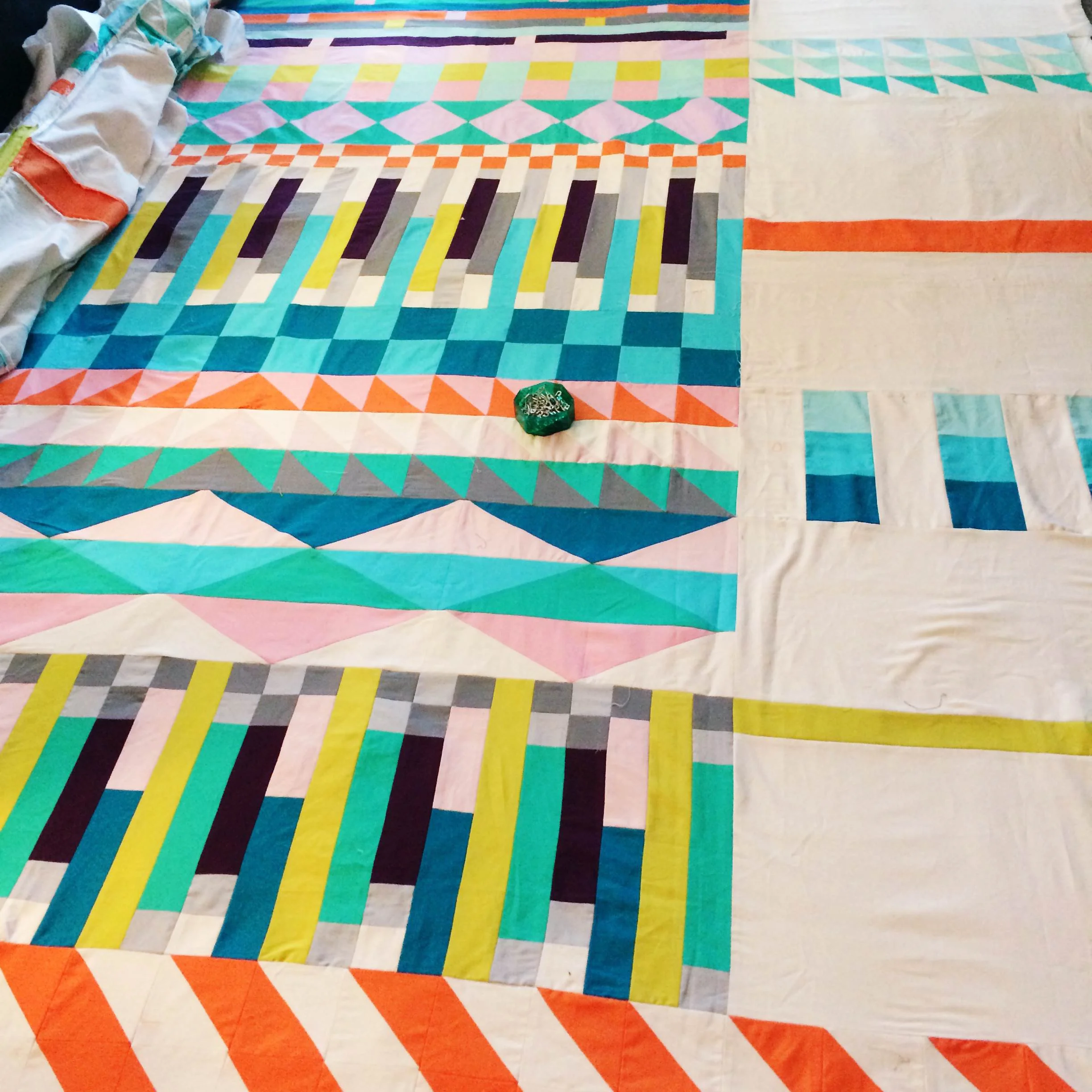 I’m still quilting, although coming through a long, slow, slow, slow period of “maker's-block”. Life got in the way a bit and I lost the momentum of frequent studio time, which is one surefire way to drain your creative mojo quickly. Since moving to San Francisco a year ago, I’ve made a much better effort to give myself room to work on projects without too many expectations. I’ve also tried to rebuild some type of creative routine and practice. I’ve been chipping a few long-idled projects off my list, This beautiful custom quilt for Carey is one of them. Read more about Carey’s Custom Quilt. This quilt was created especially to feature vintage bed linens that belonged to Carey’s grandmother. It was such a pleasure to work with such personal materials and ensure their continued use and presence in Carey’s life. Hand quilting is still my favorite part of the process, and I continue to be obsessed with adding little wool ties that will eventually felt into bitty, wonky pom-poms.